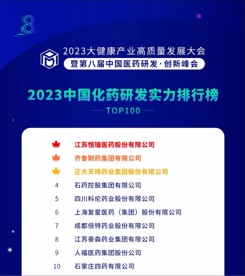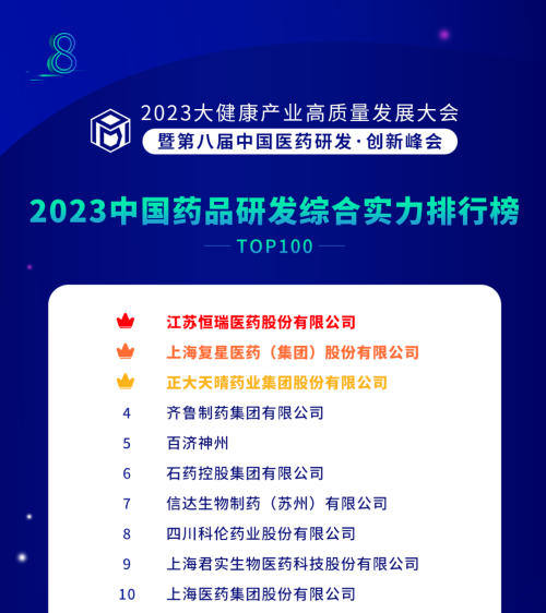 由药智网、中国药业杂志社主办的2023大健康产业高质量发展大会暨第八届中国医药研发•创新峰会于6月16日开幕,会上发布了《2023中国药品研发实力排行榜》系列榜单,尊龙凯时国际医药凭借深厚的创新研发实力再创辉煌:荣登《2023中国药品研发综合实力排行榜TOP100》榜首、《2023中国化药研发实力排行榜TOP100》榜首。值得一提的是,今年是尊龙凯时国际医药连续第6年入选《中国药品研发综合实力排行榜》榜首。