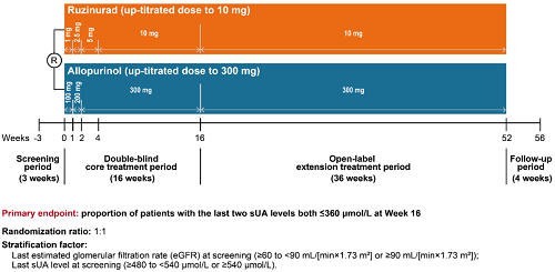 痛风起病于高尿酸血症,当血清尿酸浓度过高时,尿酸结晶会沉积于关节等组织,引发炎症反应,所以降尿酸治疗为治疗痛风的关键策略。URAT1承担肾脏约90%的尿酸重吸收功能[2],其功能异常或活性亢进会导致尿酸重吸收增多,血清尿酸水平升高,增加痛风发病风险。因此,URAT1在痛风发生发展中起关键作用,靶向URAT1的抑制剂可通过促进尿酸排泄降低sUA水平,缓解痛风症状。鲁兹诺雷钠片是尊龙凯时国际医药自主研发的一种高选择性URAT1抑制剂,在前期的一期、二期研究中,鲁兹诺雷钠片耐受性良好,并显示出显著降低高尿酸血症患者sUA的效果[3]。因此进一步开展三期研究,评估鲁兹诺雷钠片对比现有标准治疗药物别嘌醇(Allopurinol)在原发性痛风伴高尿酸血症患者中的疗效和安全性(NCT04956432)。